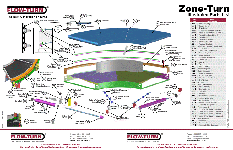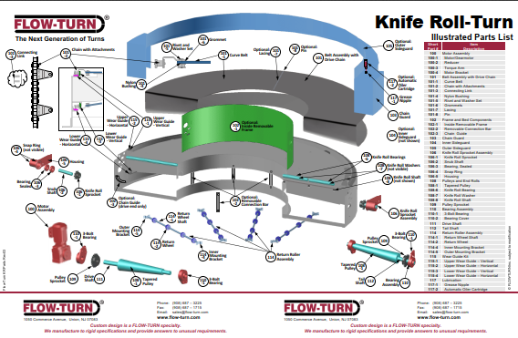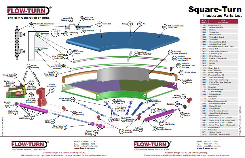Flow-Turn offers a comprehensive range of spare parts to suit all Flow-Turn conveyors. You can use the illustrated parts lists (IPLs) below to help you identify replacement parts.